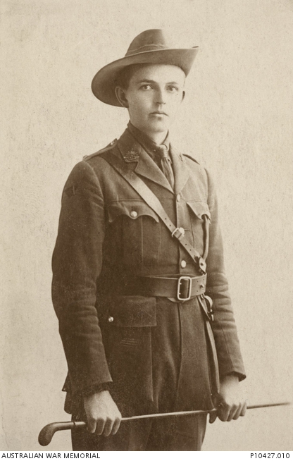 Unknown, Studio portrait of Second Lieutenant (2nd Lt) William Leo Trenerry, 19th Battalion, 1916, photograph, https://www.awm.gov.au/collection/C1285387 uniform can vouch for–or perhaps the men he saved, as he wielded his Lewis gun in the trenches of France like he wields his willow
