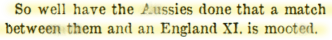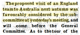 The M.C.C., Hampshire Advertiser (Hampshire), Sat 3 May 1919, p.7. with the M.C.C. committee, and we should have a decision in the next few weeks. So well have the Aussies done that a match between them and an England XI is mooted.