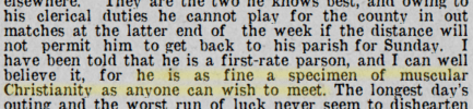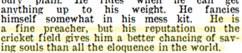 Sir Home Gordon, Rev. F. H. Gillingham and Other Cricketers, The Tatler (London), Wed 22 Jun 1919, p.32.. He is a fine preacher, but his reputation on the cricket field gives him a better chance of saving souls than all the eloquence in the world.