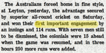 Essex v Australians, Gloucestershire Echo (Gloucestershire), Sat 17 May 1919, p. 6. against our first County in the form of Essex. It was not only our first important engagement,