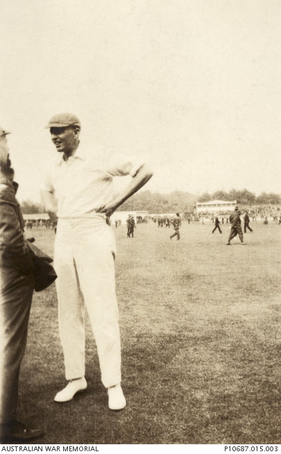 Harry Downes, Informal portrait of 30710 Gunner (Gnr) John Tinline “Jack” Murray, 103rd Howitzer Battery, 1919, photograph, https://www.awm.gov.au/collection/C1293059 gave a fine display of free, fearless cricket.