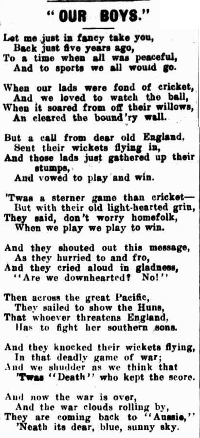 Elsie G. Thompson, Our Boys, Wellington Times (NSW), Thu 10 Apr 1919, p.3. http://nla.gov.au/nla.news-article143234190 I have included the entire poem here as it is a good example of the language around sport and the military during the war. have been fighting too, and have not allowed their cricket to grow rusty; they have found time to play the game, and fight as well.