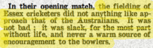 Innings Victory for Colonials, Sheffield Independent (Yorkshire), Tue 20 May 1919, p.9. The fielding of Essex cricketers did not anything like approach that of the Australians. It was not bad; it was slack, for the most part without life, and never a warm source of encouragement to the bowlers.