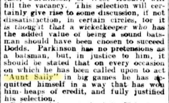 Cricketers and Cacklers, Sydney Sportsman (NSW), Wed 31 Mar 1915, p. 4. http://nla.gov.au/nla.news-article167285076. “Plum” opined the Australians will prove far stronger than people imagine