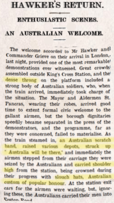 Hawker’s Return, Western Daily Press (Bristol), Wed 28 May, 1919, p.8. , was Hawker himself! Proudly wearing the slouch hat, put there by a Digger in that custom of popular honour