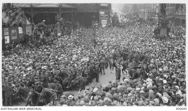Unknown, An AIF band leading the procession from King’s Cross Station, in connection with the welcome to Mr H G Hawker and Commander Grieve, 1919, photograph, https://www.awm.gov.au/collection/C980571 . Then appearing out of the milieu, riding high upon a police horse