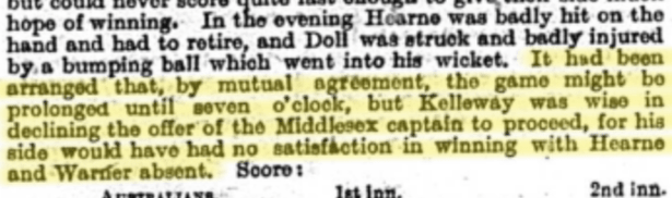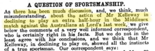 A Question of Sportsmanship, The Field (London), Sat 7 June 1919, p. 747. . It had been arranged that, by mutual agreement, the game might be prolonged until seven o’clock. Some are saying Kelleway was wise in declining the offer of the Middlesex captain to proceed, for the side would have no satisfaction in winning with