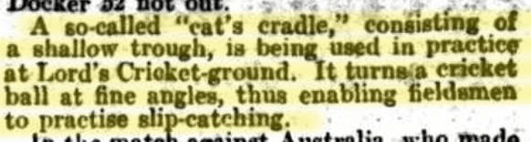 The “Brightside Unionist Record”, Sheffield Daily Telegraph (Yorkshire), Fri 1 Nov 1912, p. 2. . A so-called “cat’s-cradle,” consisting of a shallow trough, is being used in practice at Lord’s Cricket-ground. It turns a cricket ball at fine angles, thus enabling fieldsmen to practice slip-catching.