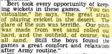 Oxford v. Australians, Western Daily Press (Bristol), Fri 30 May 1919, p. 7. was remarked upon by many in Oxford. Bert compared it to his days playing in Egypt: ‘You can visualise the great strain of playing cricket in the desert. The glare of the sun was terrific. Our pitch was made from wet sand rolled out hard, and the outfield, of course, was all sand’