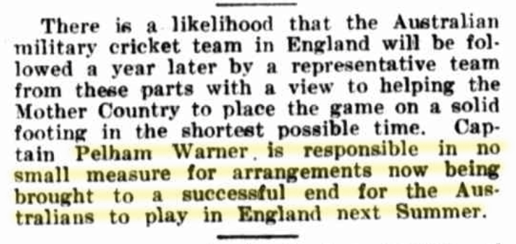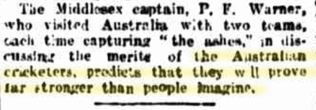 Mid On, Cricket, The West Australian ( WA), Sat 11 Dec 1915, p. 9. http://nla.gov.au/nla.news-article26965642 Plum Warner, responsible in no small measure for the tour