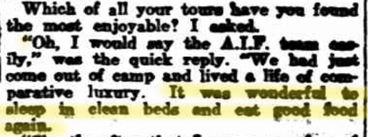 Magazines, Aberdeen Press and Journal (Aberdeenshire), Tue 18 Mar 1919, p. 2. . Expecting him to say something about the opportunity to play with and against some true legends of the game he responded wryly ‘it’s wonderful to sleep in clean beds and eat good food again’