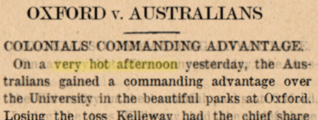 Cricket, Winner (Vic.), Wed 12 Aug 1914, p. 5. http://nla.gov.au/nla.news-article155522545 from Oxford University. Being just a two day game, a draw was almost inevitable, despite the strong showing by the Australians. Most notable was the introduction of a new man into our band of flannelled brothers