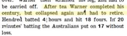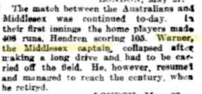 Stand by Warner and Hendren, The Sporting Life (London), Wed 28 May, 1919, p.5. . After tea Warner completed his century, but collapsed again and had to retire