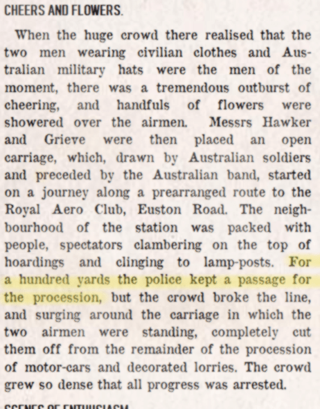 Hawker’s Return, Western Daily Press (Bristol), Wed 28 May, 1919, p.8. , unable to keep a dense throng