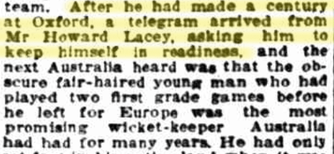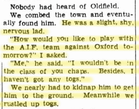 Rambler, When Bert Oldfield was a Mystery, Sporting Globe (Vic), Sat 1 Dec 1928, p.6. http://nla.gov.au/nla.news-article183969110 . When Collins asked the slight, shy, nervous lad if he would like to play against Oxford, Oldfield responded ‘Me? I wouldn’t be in the class of you chaps. Besides, I haven’t got any togs’. Collins joked they almost had to kidnap him to get him to the ground while they rustled up togs.