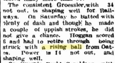 Cricket, The Mercury (Tas.), Mon 24 Jan 1910, p.7. http://nla.gov.au/nla.news-article238952848 after the latter named copped