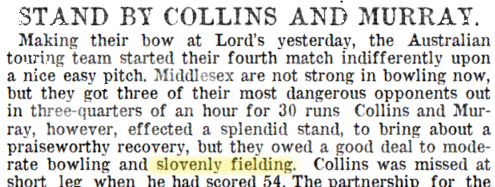 Middlesex v. Australians, The Scotsman (Midlothian), Wed 28 May, 1919, p.10. . But I think it shows that this is a team sport and the Australians’ superior fielding is what can win matches. The quality of the bowling is irrelevant when the batsman finds the umpire’s finger against him