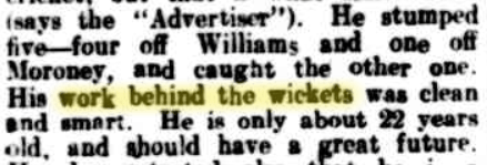 Cricket Causerie, London Daily News (London), Thu 31 May 1906, p.11. , even to Gregory’s pace, his work behind the wickets