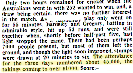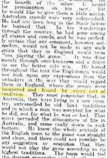 Yesterday’s Cricket, Sunday Times (WA), Sun 16 Jan 1910, p. 1. http://nla.gov.au/nla.news-article57597122 . At this point the crowd–although Podsnappian