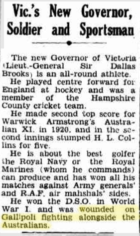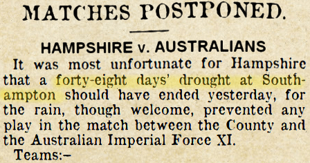 I’m indulging in what I call an ‘anachronistic wink’ here – given Brooks’ future involvement in Australian government. Cricket, The Scone Advocate (NSW), Tue 25 Nov 1919, p. 2. http://nla.gov.au/nla.news-article156905342 . Unfortunately, the forty-eight days’ drought at Southampton