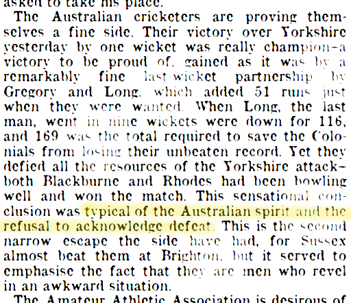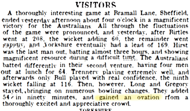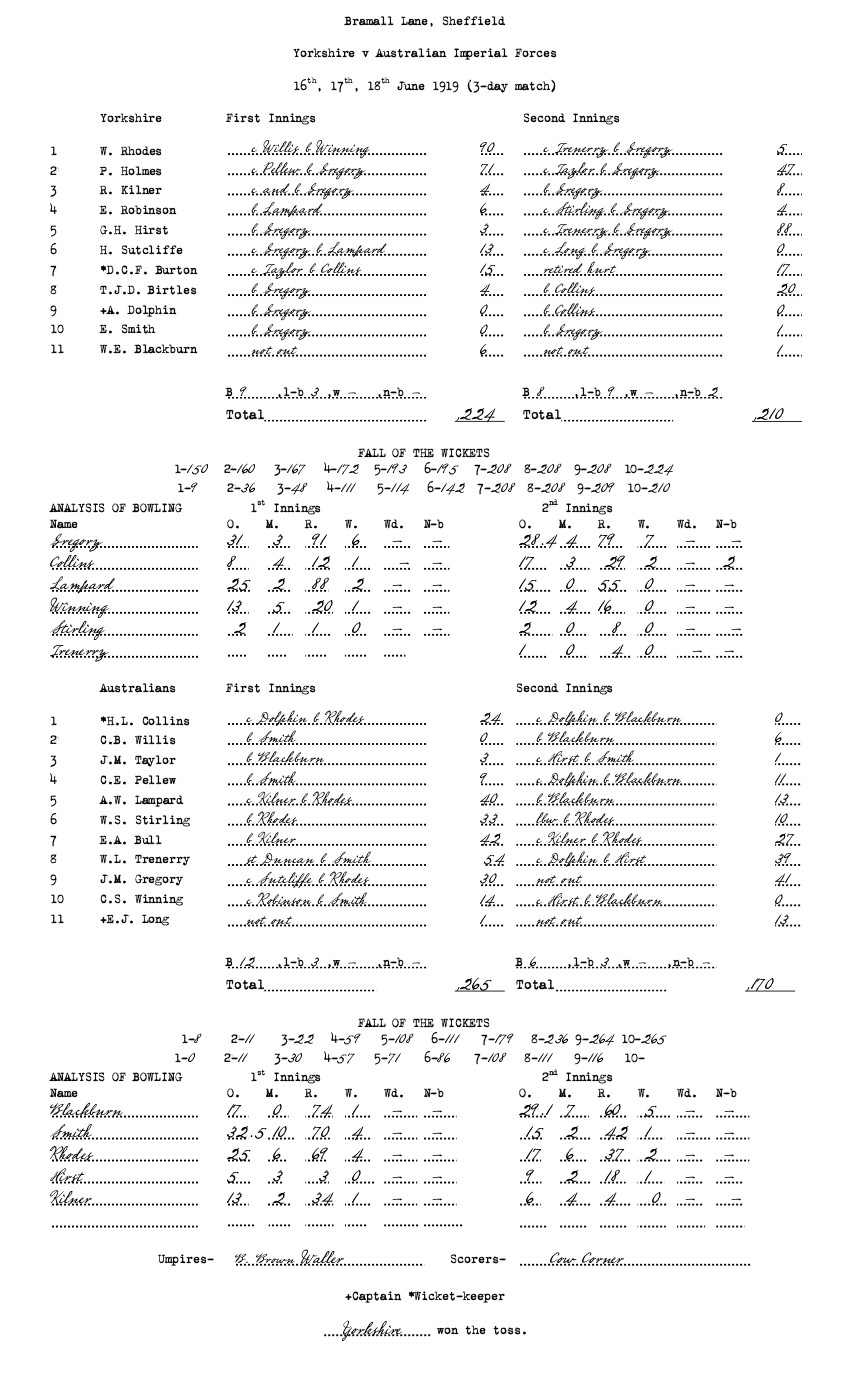 Yorkshire v. Australians, The Scotsman (Midlothian), Thu 19 Jun 1919, p. 8. of true sportsmanship