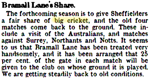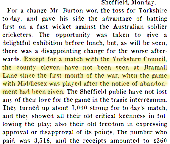 The Editor, Leaves From My Notebook, Star Green ‘un (Yorkshire), Sat 14 Jun 1919, p. 1. . Except for a match with the Yorkshire Council, the county eleven have not been seen at Bramall Lane since the first month of the war, when the game with Middlesex was played after notice of abandonment had been given