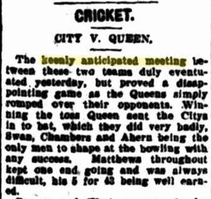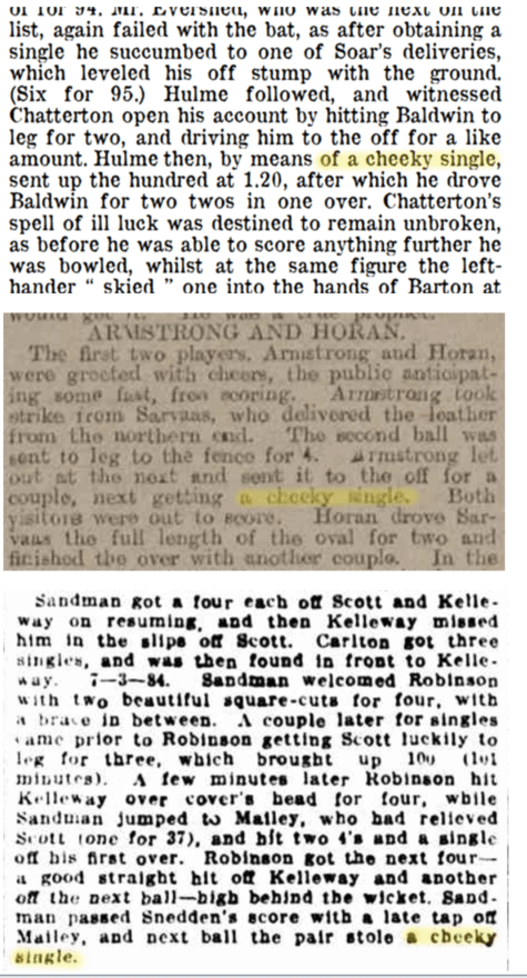 My first sense was that using ‘cheeky’ like this is a bit anachronistic. However, on examination the phrase ‘a cheeky single’ (to mean taking one run when there probably shouldn’t have been a run there to take) came into the cricket lexicon by at least 1892 (top) in the UK and 1905 (middle) in Australia. Therefore, although ‘cheeky mention’ may not have contemporaneous examples, I feel it is legitimate in this sense to use, as the journalist is repurposing a cricket phrase to describe a conversational equivalent of a ‘cheeky single’. Having an example that happens to mention Kelleway (bottom) is a happy bonus, that also shows it was in contemporary use.