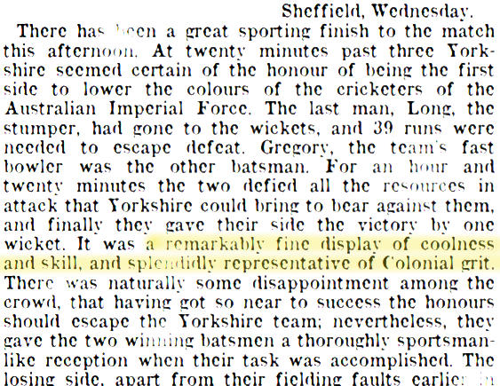 Cricket, Yorkshire Post and Leeds Intelligencer (Yorkshire), Thu 19 Jun 1919, p. 12. Gregory and Long, typical of the Australian spirit, refuse to acknowledge defeat