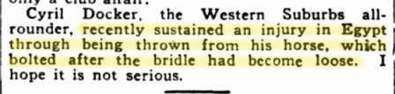 Bottom: Inter-State Cricket, Saturday Referee and the Arrow (NSW), Sat 27 Dec 1913, p.2 http://nla.gov.au/nla.news-article117418176 mention that he also had been wounded in the desert