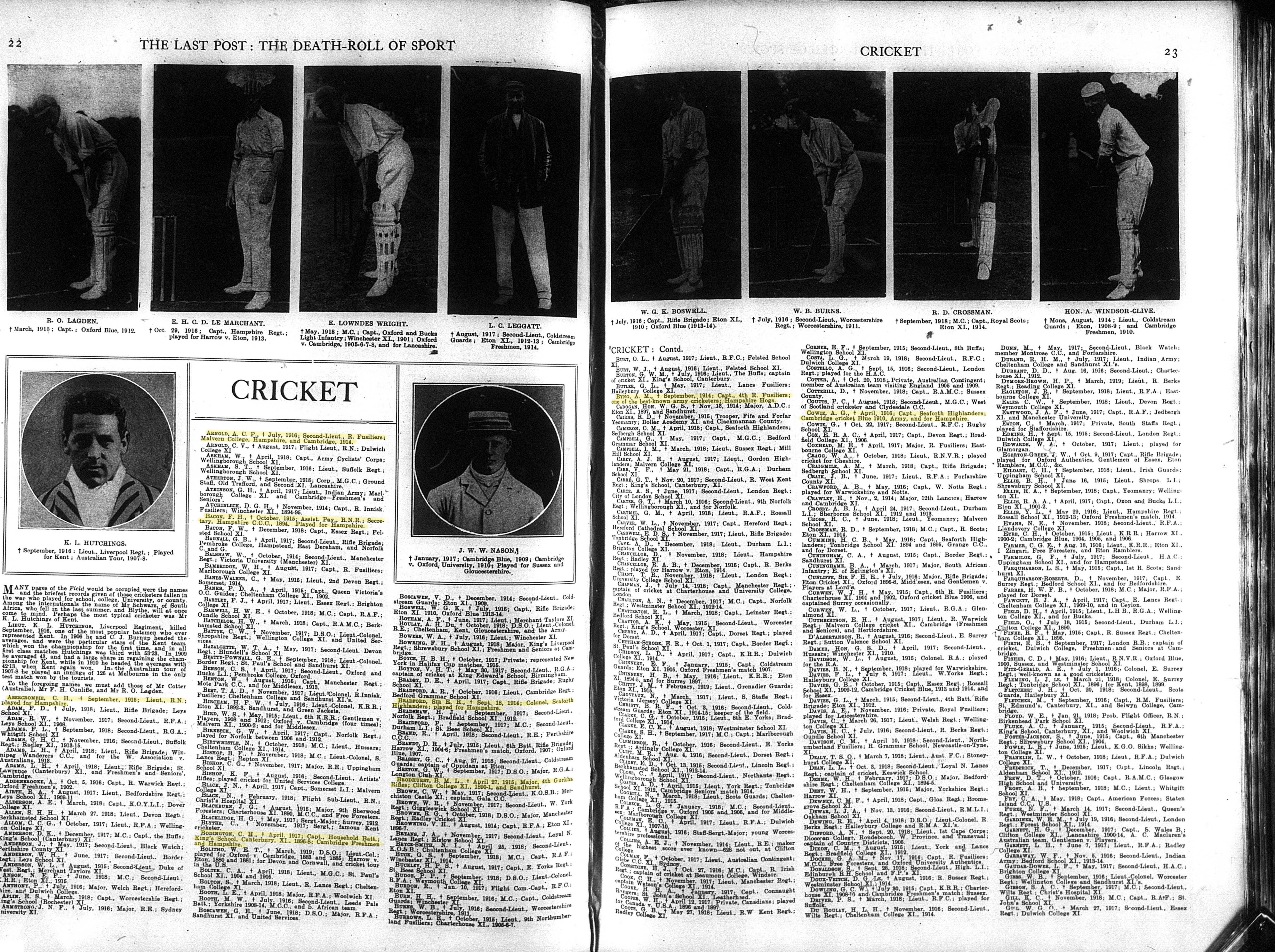 Dave Allen, Honours Board, 2019, photograph, https://anthonycondon.com/wp-content/uploads/2019/06/hampshire-honours-board.jpg supplied personally courtesy of Dave Allen. More than the 15 lost Australian Sheffield Shield playersThis is the number published by the Australian Cricketers’ Association in 2018, however, in June of 1919 – the time of this article – all of these deaths had been reported on in the Australian press. This presents a striking difference to the Hampshire players, many of whom were not reported on as having been killed by June 1919. ACA remembers fallen first-class cricketers, Australian Cricketers’ Association, Australia, 2018, https://www.auscricket.com.au/news-media/news-articles/aca-remembers-fallen-first-class-cricketers (accessed 14 Apr 2019). . Such was the depletion of the Hampshire side that Ledger Hill