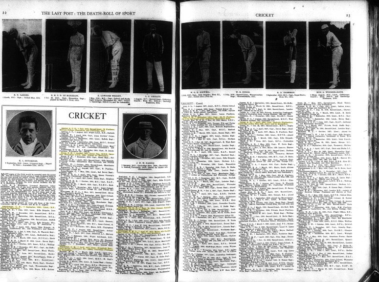 Hampshire’s First Match, Hampshire Advertiser (Hampshire), Sat 7 Jun 1919, p. 6. . In total they lost at leastNot all of the Hampshire players lost are listed as playing for Hampshire in the Death Roll of Sport (DROS – see following popups), but they were all reported as playing for Hampshire at the time they played. Additionally, there are a number of players missing from the DROS. Along with the 17 listed in the DROS is Gordon Belcher, whose death was reported in 1915. Captain G. Belcher, Reading Mercury (Berkshire), Sat 29 May 1915, p. 2. Not included in this number, but listed on the Hampshire County Cricket Club Roll of Honour memorial (date unknown) are C.N. Stucliffe and H. Rogers. The most comprehensive list, not published until 2014, lists a total of 24 Hampshire players who died, and also includes a photograph of the monument. The players on this list not already mentioned did not have their deaths reported in contemporary sources. Andrew Renshaw (ed.), Wisden on the Great War: The Lives of Cricket’s Fallen 1914-1918 (London: Wisden), 2014, pp. 22-23. The confusing nature of these lists helps to highlight the still chaotic nature of news around causalities of the war in 1919. 18