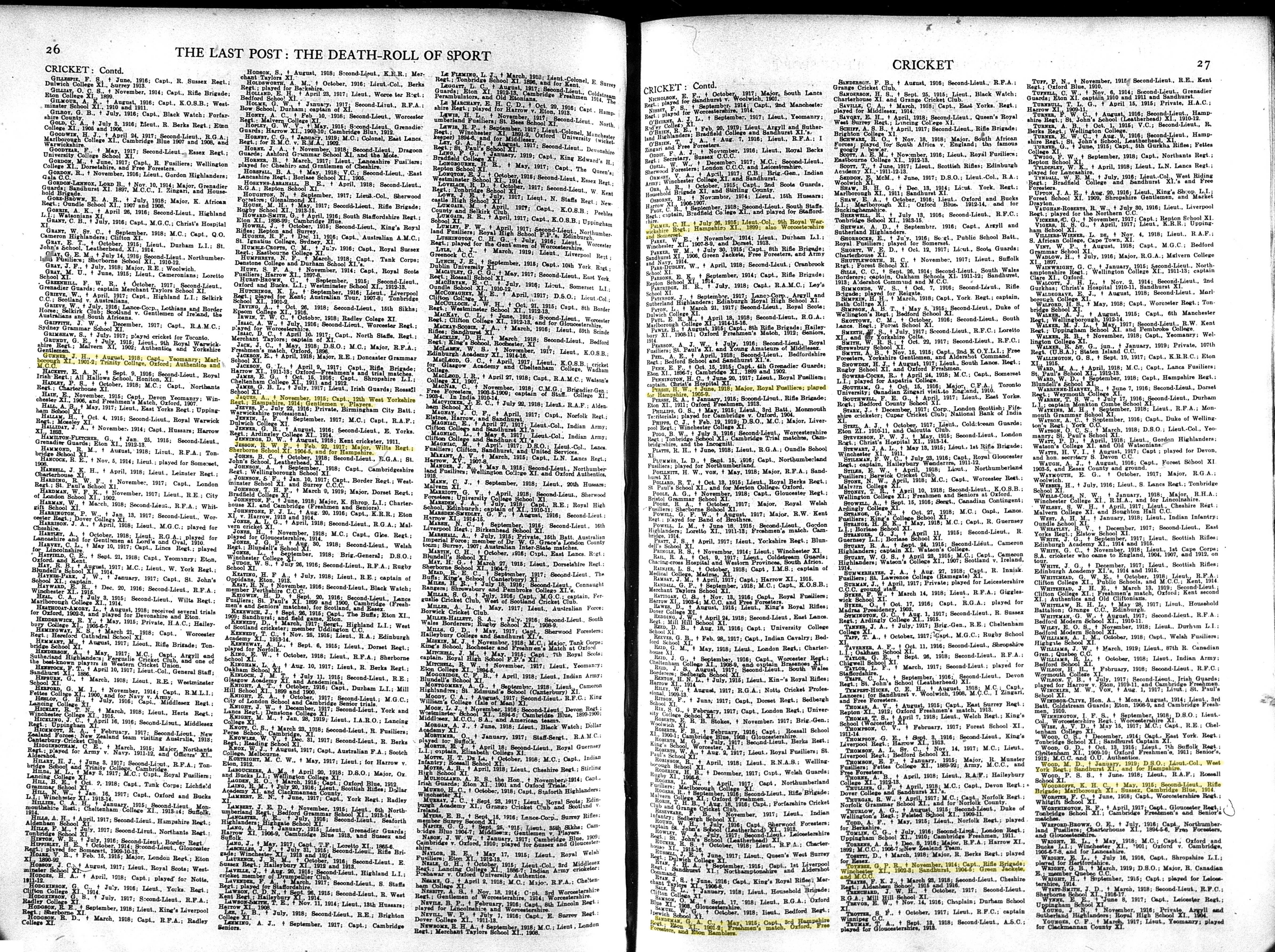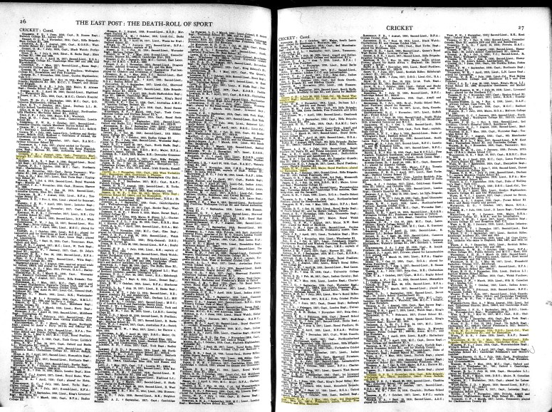 This list helps to show the full extent of the cost of the war in the U.K. The Death Roll of Sport, Special Supplement to The Field, July 1919, pp. 22-3. Click to open in a new window: https://anthonycondon.com/wp-content/uploads/2019/04/dros-11.jpg first-class cricketers