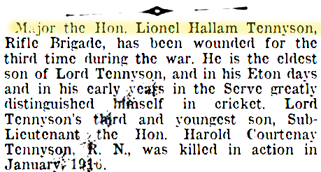 Gloucestershire Echo (Gloucestershire), Thu 6 Dec 1917, p. 1. Lionel Tennyson