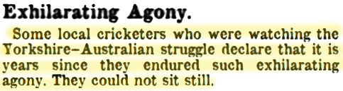 Cricket, Sheffield Daily Telegraph (Yorkshire), Thu 19 Jun 1919, p. 9. . Indeed, some local cricketers who were watching the Yorkshire-Australian struggle declared that it is years since they endured such exhilarating agony. They could not sit still