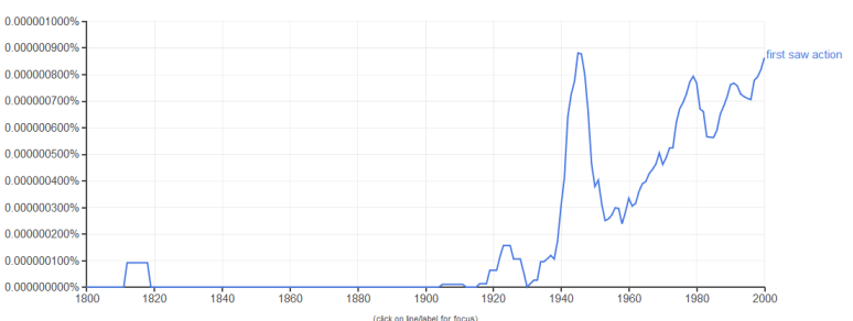 ‘First saw action’ as a military phrase comes into use in the First World War, and is used in several soldier’s letters published in newspapers in Australia and the U.K. It is never used outside of the description of a military engagement in this period; however, given the hypothesis tested by the quantification section, I have indulged in using this section to make a plausible creation of a term that becomes quite common following the Second World War. As the ngram shows, this phrase comes into popular use towards the end of the war before petering out in the 30s, and then having a massive spike in use in the Second World War, and again during the Vietnam War. against Australians playing for Cambridge