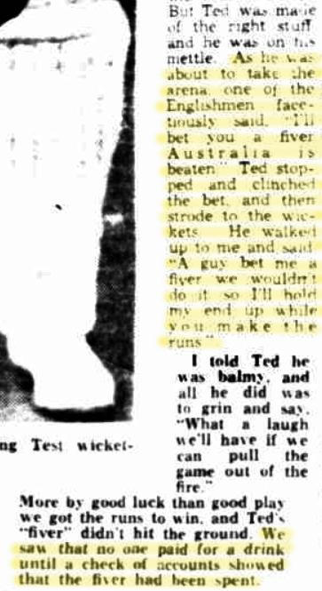 This is a transcript of a toast Sir Archibald Weigall, Governeor of South Australia, gave at a valedictory dinner for the 1920 English Ashes side. The surrounding context gives an interesting perspective on Australian crowds by an English Aristocrat. Point, Englishmen’s First Win, The Age (Vic), Wed 10 Nov 1920, p. 9. http://nla.gov.au/nla.news-article206941613 ! As Ted Long was about to take the arena, a member of the crowd facetiously said “I’ll bet you a fiver Australia is beaten.” Ted stopped and clinched the bet and then strode to the wickets. He walked up to Collins and said ‘A guy bet me a fiver we wouldn’t do it so I’ll hold up my end while you make the runs’. The bet was won and Long and Collins saw that no one paid for a drink until a check of accounts showed that the fiver had been spent.