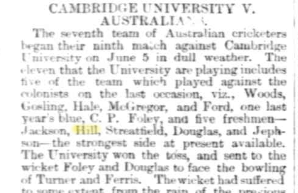 Cambridge University v. Australians, South Australian register (SA), Mon 14 Jul 1890, p. 7. http://nla.gov.au/nla.news-article47282244 against Billy Murdoch’s