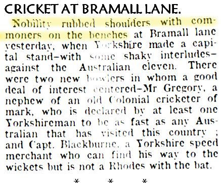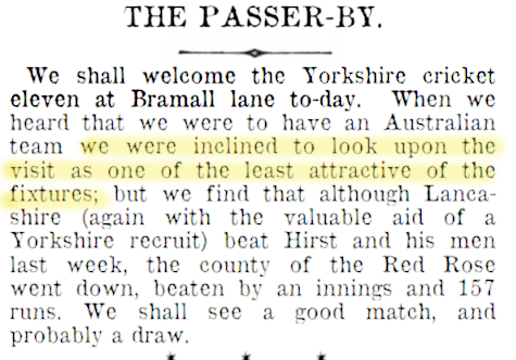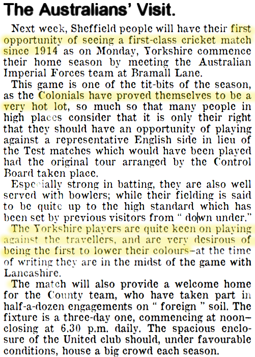 J.W., Cricket, The Australasian (Vic), Sat 7 Oct 1916, p. 25. http://nla.gov.au/nla.news-article140699917 . If what has been seen in the match between Yorkshire and the Australians at Bramall Lane during the past three days is part of that trial, it ought not to be difficult to find a following for the game
