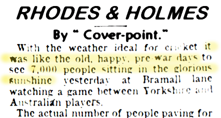 Cricket at Bramall Lane, Sheffield Independent (Yorkshire), Tue 17 Jun 1919, p. 4. amongst the 7,000 people sitting in the glorious sunshine