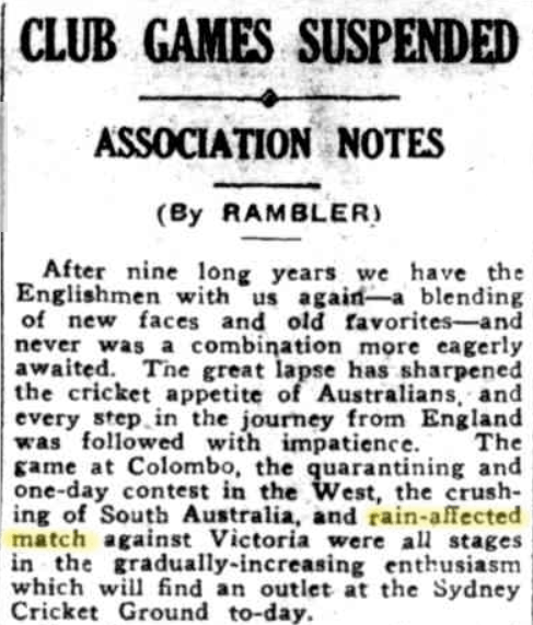 Not Out, The Umpire Matter, Referee, Wed, 16 Feb, 1916, p. 12. http://nla.gov.au/nla.news-article121179742 . Unfortunately, we didn’t get too see too much of Brooks in the rain-affected match
