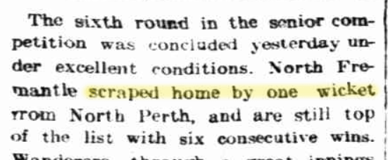 Sporting Gossip, Gloucestershire Echo (Gloucestershire), Thu 19 Jun 1919, p. 5. and they scraped home by one wicket