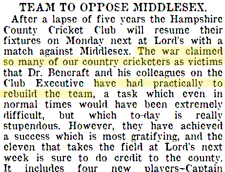 Cricket, Sheffield Daily Telegraph (Yorkshire), Thu 19 Jun 1919, p. 9. this season, and indeed, our lot