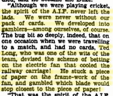 W.A.S. Oldfield quoted in J. Mathers, The Diggers Make a Team, The Daily Telegraph (NSW), Sat 27 Apr 1935, p. 6 http://nla.gov.au/nla.news-article246691864 . We’ve developed into gamblersThe journalist including himself in the ‘we’ of the team is a deliberate muddying of roles, highlighting both the shared experience of war, as well as the sometimes blurred lines of the embedded journalist –among ourselves, of course. The bug has bitten so deeply, indeed, that on the trip from one end of the nation to the other to get us to Hampshire, finding ourselves without a deck of cards, Ted Long, who is one of the wits of the team, devised the scheme of betting on the electric fan that cooled the railway carriage! He stuck a piece of paper on the frame-work of the fan, and gambled which blade would stop closest to the piece of paper