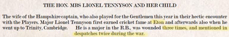 Unknown, The Right Honourable Lord Lionel Hallam Tennyson, Hampshire County cricket team, c. 1922, photograph, https://upload.wikimedia.org/wikipedia/commons/e/ef/Lionel_Hallam_Tennyson_c1922.jpg , grandson of the poet of that name, play his first match against an Australian side. The war claimed so many of the county’s cricketers as victims that they have had practically to rebuild the team