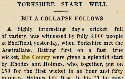 English Cricket, The Brisbane Courier (QLD), Mon 1 Jul 1912, p. 7. http://nla.gov.au/nla.news-article19850125 . The County