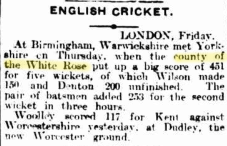 Cricket, The Northern Miner (QLD), Mon 8 Mar 1915, p.6. http://nla.gov.au/nla.news-article79078847 against the county of the White Rose