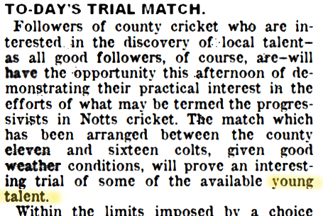 Triangular Tests and County Cricket, West Sussex Gazette (Sussex), Thu 2 May 1912, p. 3. , and many others to introduce themselves to their County’s young talent