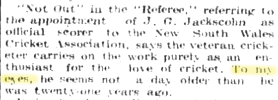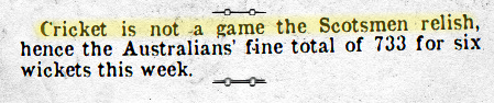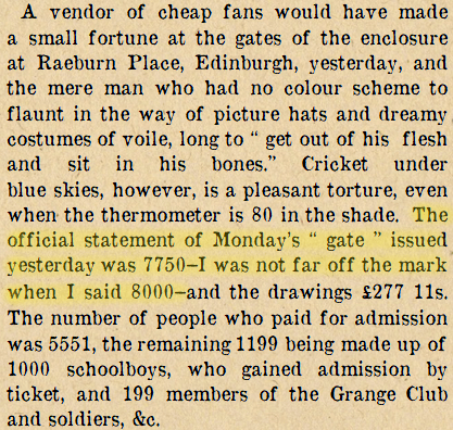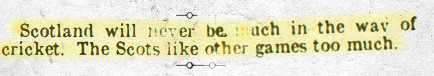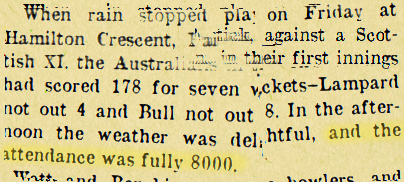 Some say that cricket is not a game the Scots relishFlashes and Glances, Star Green ‘Un (Yorkshire), Sat 5 Jul 1919, p. 1. , that they will never be much in the way of cricket as they like other games too muchFlashes and Glances, Star Green ‘Un (Yorkshire), Sat 12 July 1919, p. 1., but to my eyesCricket, Clarence and Richmond Examiner (NSW), Sat 6 Sep 1913, p. 11. http://nla.gov.au/nla.news-article62069485 nothing is further from the cricket truthA Cricket Celebrity, The Sydney Mail and New South Wales Advertiser, Wed 24 Aug 1910, p. 52. http://nla.gov.au/nla.news-article164342161 . It is sureOur Visiting Bowlers, The Telegraph (QLD), Fri 17 Apr 1914, p. 2. http://nla.gov.au/nla.news-article176175784 that Scottish cricket is not yet on a par with the English gameEssex Far Too Good For Forfarshire, Dundee Courier (Midlothian), Thu 29 Jun 1911, p. 6. , but the enthusiasm displayed by the spectatorsShort Slip, Cricket Notes, Cootamundra Herald, Tue 8 Feb 1910, p. 2. http://nla.gov.au/nla.news-article144032196 shows that lack of skillMid Off, Cricket, The Express and Telegraph (SA), Fri 23 Dec 1910, p. 6. http://nla.gov.au/nla.news-article210005123 does not amount to lack of zealW. B. Pryor, Letter To The Editor, The Maitland Daily Mercury (NSW), Sat 4 Jun 1910, p. 3. http://nla.gov.au/nla.news-article125297879 . Not only did the attendances compare favourablyGlengarry, Examiner (Tas), Tue 8 Jan 1918, p. 7. http://nla.gov.au/nla.news-article50961281 with those of the 1909Australians v. Scotland, The Scotsman (Midlothian), Wed 30 Jun 1909, p. 7. and 1912Cricket, The Scotsman (Midlothian), Wed 10 July 1912, p. 14. Australians, but the crowd of 8000Scotland Draw With Australians, Dundee Courier (Angus), Mon 7 July 1919, p. 6. that attended the Saturday in Glasgow eclipsed any previous crowdCycling, The Sun (NSW), Sat 21 Mar 1914, p. 7. http://nla.gov.au/nla.news-article229245819 seen in Scotland since Darling led the AustraliansLast Test Match, Lancashire Evening Post (Lancashire), Mon 14 Aug 1905, p. 3. here in 1905Scottish Disaster, Dundee Courier (Angus), Wed 19 Jul 1905, p. 6. .