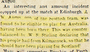 The links between the two nationsBelgium’s Thanks, The World’s News (NSW), Sat 11 Dec 1920, p. 11. http://nla.gov.au/nla.news-article128692684 were on display during a chat following the second game in Glasgow. A.W. Angus, one of the Scottish team, was found to be eligible to play for Australia having been born there. This was counterbalanced W.S. Stirling declaring that his people hail from Kilmarnock, so that he should have been playing for ScotlandAustralians To Come North Again, Dundee Courier (Angus), Sat 12 Jul 1919, p. 3.!