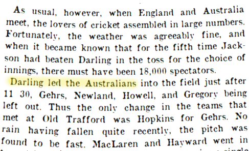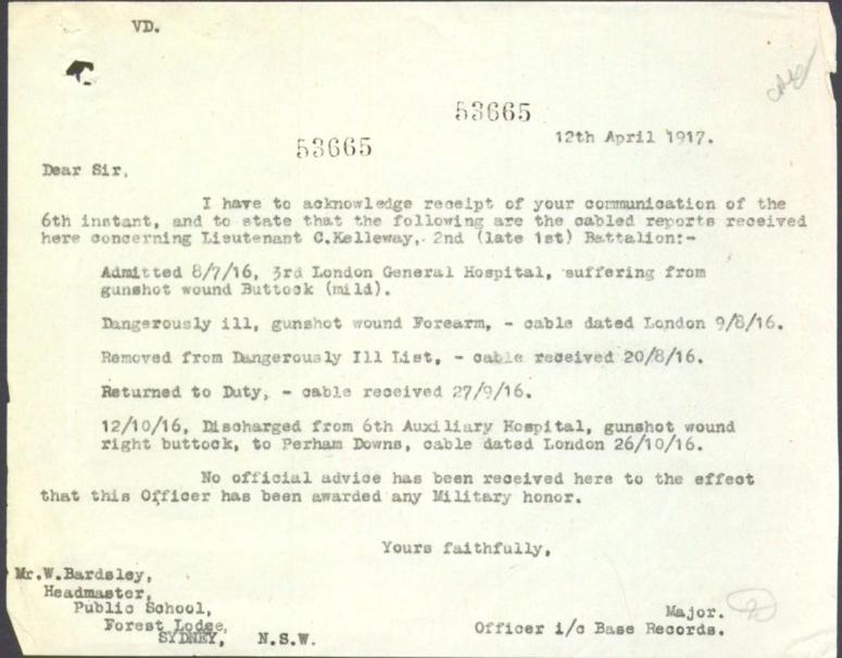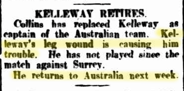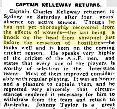 , and put in for early repatriation on June 12NAA B2455, KELLEWAY CHARLES, p. 22. https://recordsearch.naa.gov.au/SearchNRetrieve/Interface/ViewImage.aspx?B=7336920 , when the rest of the team was at Old Trafford. News is that he is due to return to Australia next weekKelleway Retires, Advocate (Tas), Mon 30 Jun 1919, p. 3. http://nla.gov.au/nla.news-article66491346 . Word has also reached me that his former Headmaster at Forest Lodge, Mr Bardsley, was also under the impression that Kelleway had won military honours in the warNAA: B2455, KELLEWAY CHARLES, p. 12. https://recordsearch.naa.gov.au/SearchNRetrieve/Interface/ViewImage.aspx?B=7336920 something that could also not be confirmed with HQNAA: B2455, KELLEWAY CHARLES, p. 27. https://recordsearch.naa.gov.au/SearchNRetrieve/Interface/ViewImage.aspx?B=7336920 . Far be it from me to disparageAno Pheles, Moresby The Micawber, Papuan Courier (PNG), Fri 21 May 1920, p. 2. http://nla.gov.au/nla.news-article251056634 the word of an officer and a gentlemanStanley Portal Hyatt, The Veiled Lady, The Express and Telegraph (SA), Sat 8 Sep 1912, p. 9. http://nla.gov.au/nla.news-article209958181 , but I feel it important for my own journalistic integrity to publish everything and every nameThe Proper Study, The Evening Telegraph (QLD), Sat 4 Mar 1911, p. 2. http://nla.gov.au/nla.news-article214961646 .